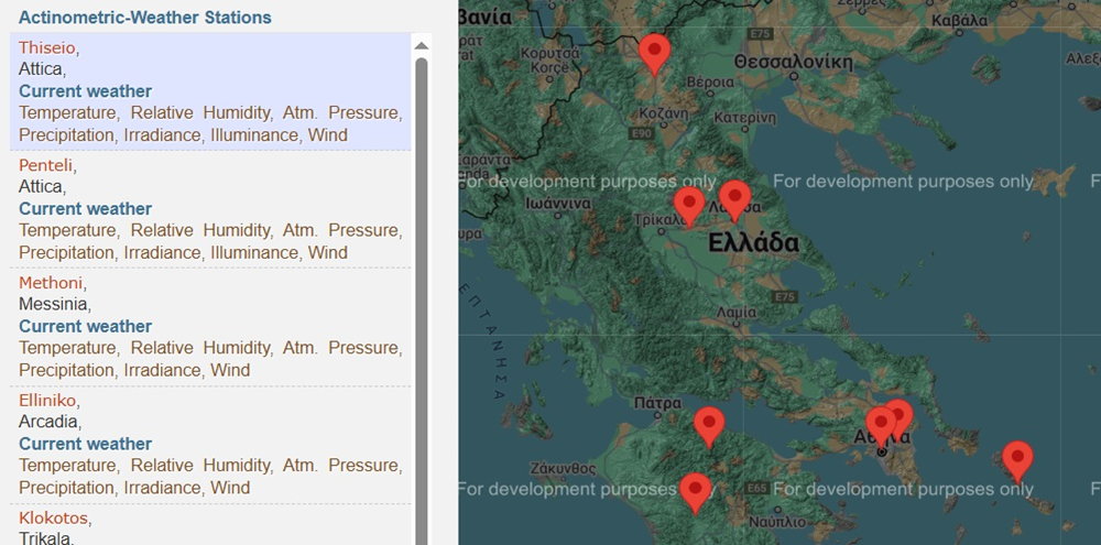 Σε όλους τους παραπάνω ακτινομετρικούς σταθμούς εκτός Αττικής καταγράφεται η ένταση της εισερχόμενης ολικής ηλιακής ακτινοβολίας (W/m2), ενώ σε τρεις από αυτούς καταγράφεται ταυτόχρονα η ένταση της διάχυτης συνιστώσας της ηλιακής ακτινοβολίας και η διάρκεια ηλιοφάνειας (σε λεπτά).